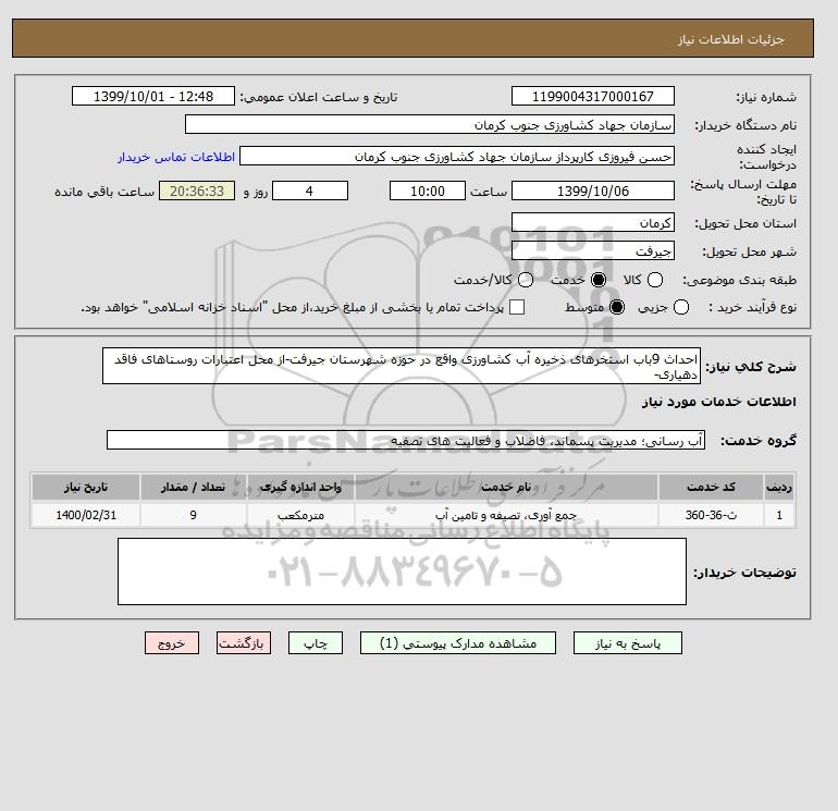 شرح کلی نیاز: احداث 9باب استخرهای ذخیره آب کشاورزی واقع در حوزه شهرستان جیرفت-از محل اعتبارات روستاهای فاقد دهیاری-