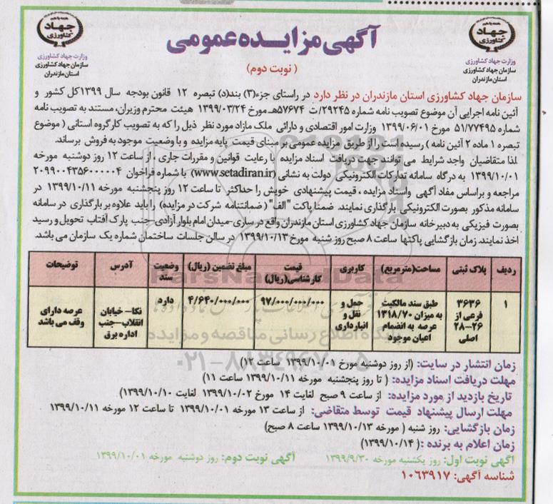 مزایده فروش ملک مازاد 3636 فرعی نوبت دوم