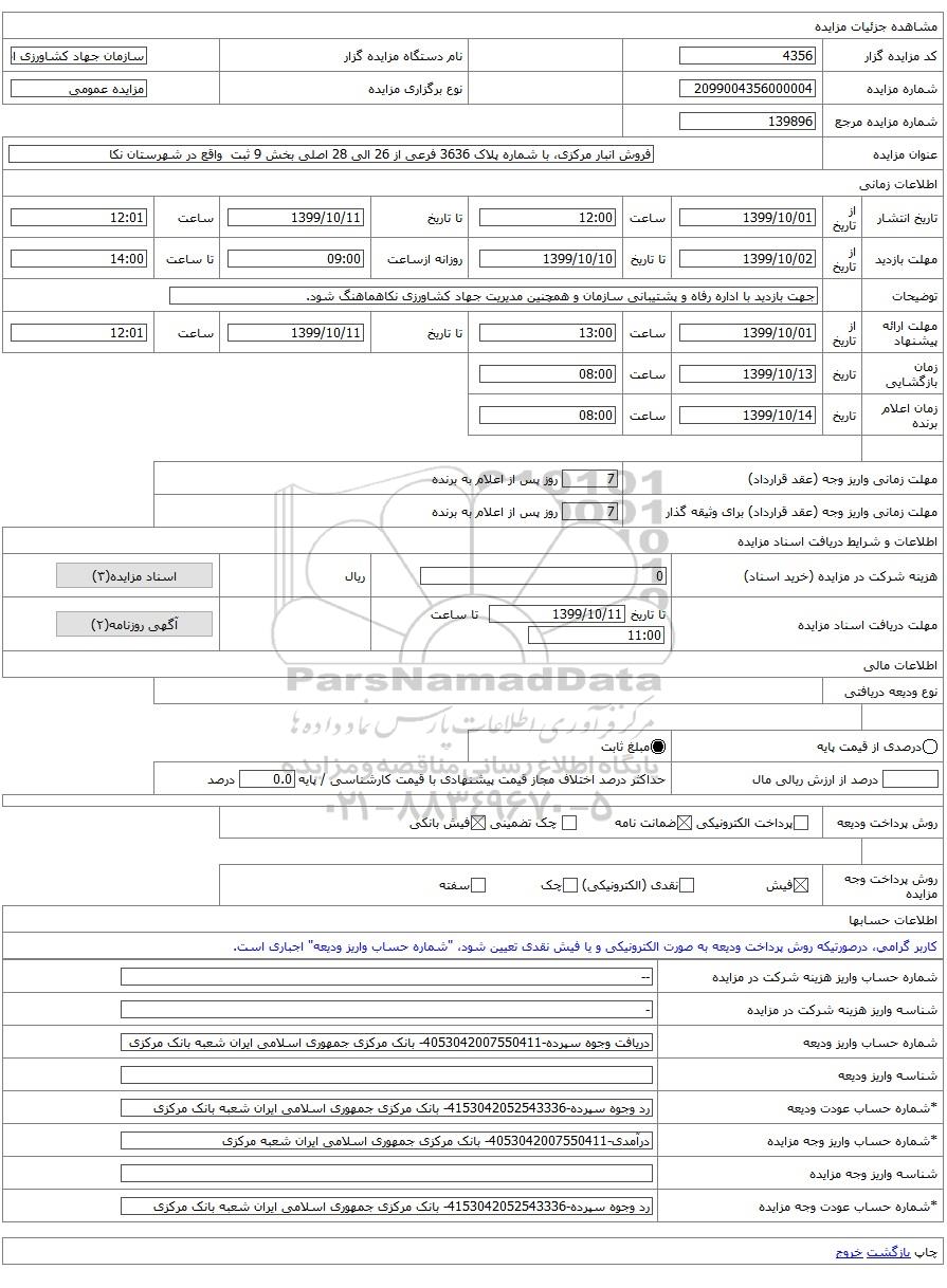 | عنوان مزایده | فروش انبار مرکزی، با شماره پلاک 3636 فرعی از 26 الی 28 اصلی بخش 9 ثبت واقع در شهرستان نکا | |||