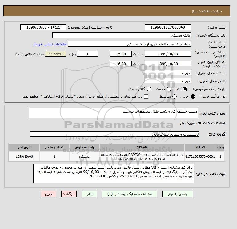 1 | 1172100537340001 | دستگاه خشک کن دست مدل RAPIDO نام تجارتی جانسون مرجع عرضه کننده اسداله دیده ور | دستگاه | 1 | 1399/10/06 |