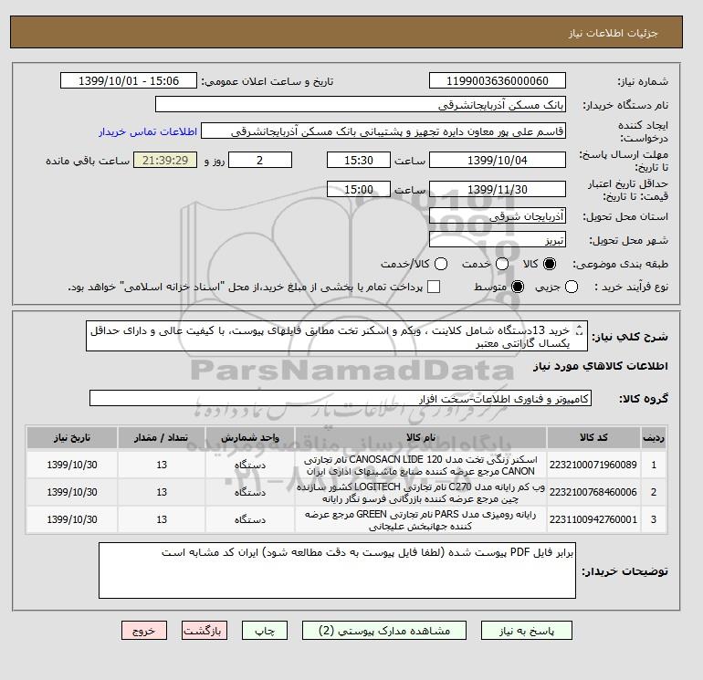 شرح کلی نیاز: خرید 13دستگاه شامل کلاینت ، وبکم و اسکنر تخت مطابق فایلهای پیوست، با کیفیت عالی و دارای حداقل یکسال گارانتی معتبر