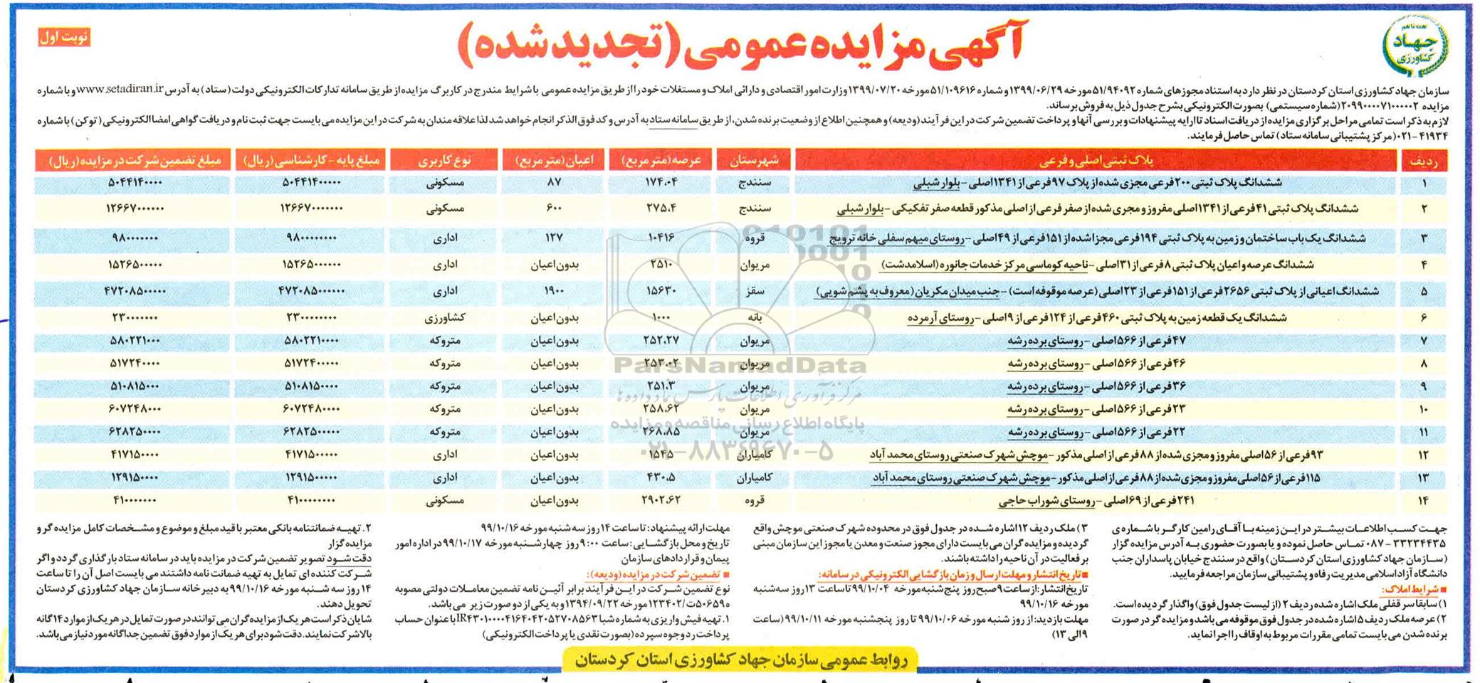 مزایده عمومی مزایده فروش املاک و مستغلات کاربری مسکونی و اداری نوبت اول برگزار میگردد. از کلیه افراد متخصص و شرکت‌های واجد شرایط دعوت به عمل می‌آید تا در این مزایده با کد خبرگزاری پارس نماد : 2992216 شرکت نمایند تاریخ شروع مزایده : 1399/10/02 مهلت شرکت در مزایده: تا پایان روز 1399/10/11 مکان برگزاری اموال واگذاری استان‌های مزایدات استان کردستان و دسته‌بندی‌های مربوط به این حراجی املاک و زمین میباشد.