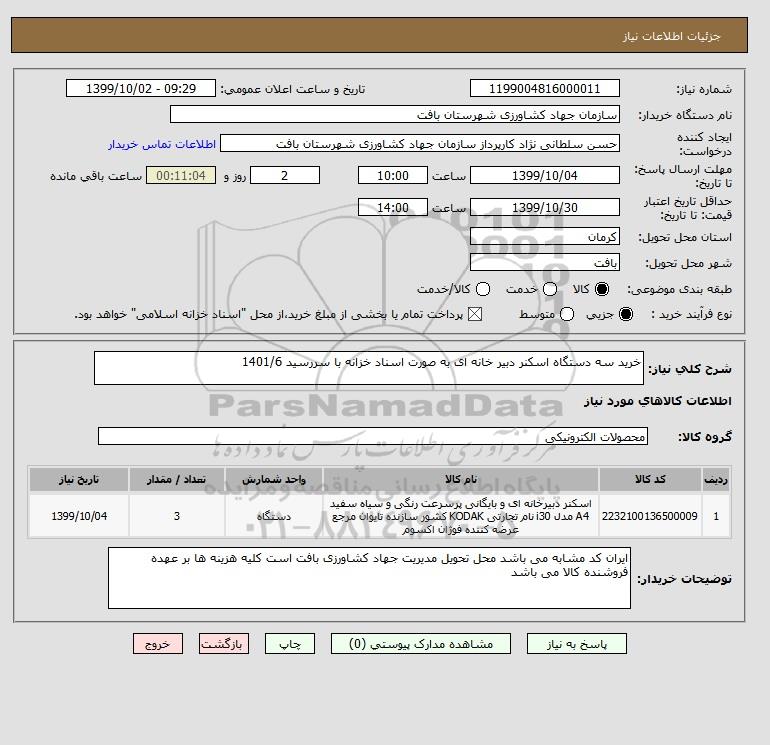 شرح کلی نیاز: خرید سه دستگاه اسکنر دبیر خانه ای به صورت اسناد خزانه با سررسید 1401/6