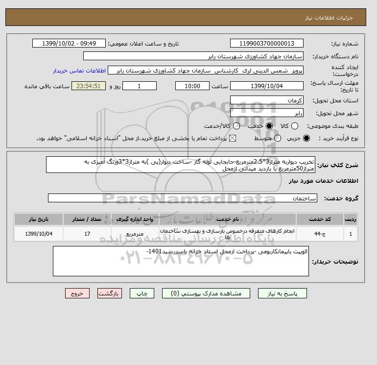 شرح کلی نیاز: تخریب دیواربه متراژ3*2.5مترمربع-جابجایی لوله گاز -ساخت دیوار(پی )به متراژ3*3ورنگ آمیزی به متراژ50مترمربع با بازدید میدانی ازمحل
