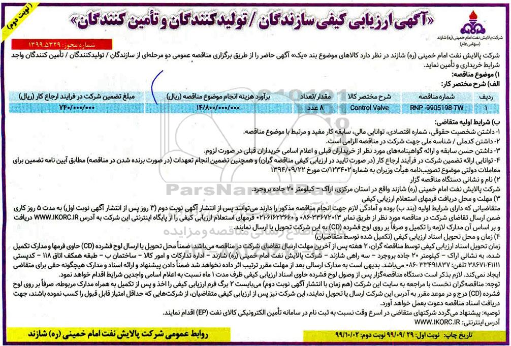 ارزیابی کیفی CONTROL VALVE - نوبت دوم از کلیه افراد متخصص و شرکت‌ها واجد شرایط دعوت به عمل می‌آید در مناقصه با کد خبرگزاری پارس نماد: 2993582 شرکت نمایند. این مناقصه در تاریخ 1399/10/02 شروع و مهلت آن تا تاریخ 1399/10/10 میباشد.