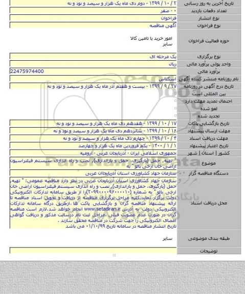 سازمان جهاد کشاورزی استان آذربایجان غربی در نظر دارد مناقصه عمومی: " تهیه, حمل (بارگیری، حمل و باراندازی), نصب و راه اندازی سیستم فیلتراسیون اراضی خان ارخی بالو " به شماره (۲۰۹۹۰۰۰۰۹۶۰۰۰۰۱۰)را از طریق سامانه تدارکات الکترونیکی دولت برگزار نماید.کلیه مراحل برگزاری مناقصه از دریافت و تحویل اسناد مناقصه تا ارائه پیشنهاد مناقصه گران و بازگشایی پاکت ها ،ازطریق درگاه سامانه تدارکات الکترونیکی دولت به آدرس www.setadiran.ir انجام خواهد شد.لازم است مناقصه گران در صورت عدم عضویت قبلی ،مراحل ثبت نام درسایت مذکور و دریافت گواهی امضای الکترونیکی را جهت شرکت در مناقصه محقق سازند .