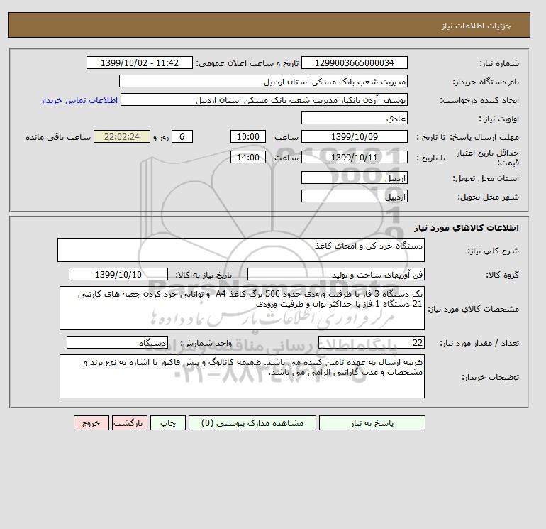 شرح کلی نیاز: دستگاه خرد کن و امحای کاغذ