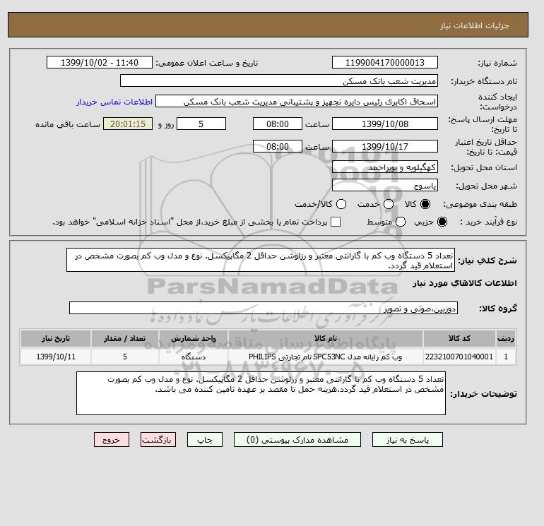 شرح کلی نیاز: تعداد 5 دستگاه وب کم با گارانتی معتبر و رزلوشن حداقل 2 مگاپیکسل. نوع و مدل وب کم بصورت مشخص در استعلام قید گردد.