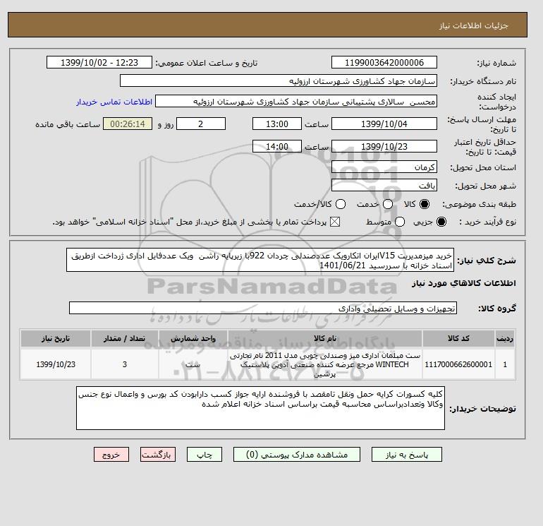 شرح کلی نیاز: خرید میزمدیریت V15ایران اتکارویک عددصندلی چردان 922با زیرپایه راشن ویک عددفایل اداری ژرداخت ازطریق اسناد خزانه با سررسید 1401/06/21