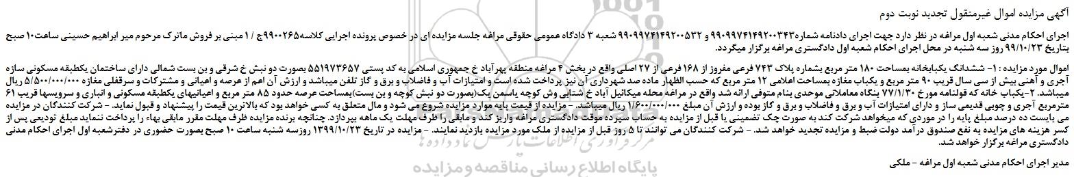 مزایده فروش ششدانگ یکبابخانه بمساحت 180 متر مربع بشماره پلاک 743 فرعی مفروز از 168 فرعی از 27 اصلی , مزایده،مزایده فروش ششدانگ یکبابخانه بمساحت 180 متر مربع بشماره پلاک 743 فرعی مفروز از 168 فرعی از 27 اصلی