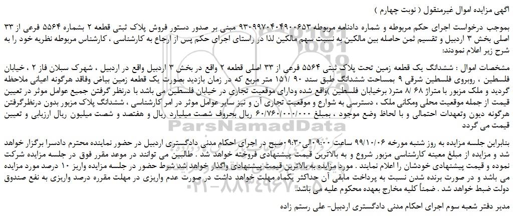 بموجب درخواست اجرای حکم مربوطه و شماره دادنامه مربوطه 9309970404900653 مبنی بر صدور دستور فروش پلاک ثبتی قطعه 2 بشماره 5564 فرعی از 33 اصلی بخش 3 اردبیل و تقسیم ثمن حاصله بین مالکین به نسبت سهم مالکین لذا در راستای اجرای حکم پس از ارجاع به کارشناسی ، کارشناس مربوطه نظریه خود را به شرح زیر اعلام نمودند: