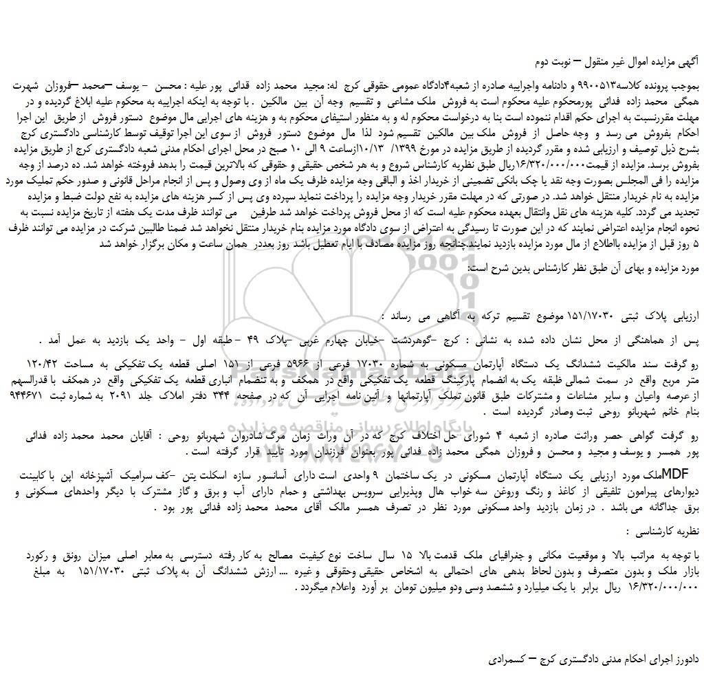 بموجب پرونده کلاسه9900513 و دادنامه واجراییه صادره از شعبه4دادگاه عمومی حقوقی کرج  له: مجید  محمد زاده  قدائی  پور علیه : محسن  - یوسف –محمد –فروزان  شهرت همگی  محمد زاده  فدائی  پورمحکوم علیه محکوم است به فروش  ملک مشاعی  و تقسیم  وجه آن  بین  مالکین  . با توجه به اینکه اجراییه به محکوم علیه ابلاغ گردیده و در مهلت مقررنسبت به اجرای حکم اقدام ننموده است بنا به درخواست محکوم له و به منظور استیفای محکوم به و هزینه های اجرایی مال موضوع  دستور فروش  از طریق  این اجرا  احکام  بفروش  می رسد  و  وجه حاصل  از  فروش  ملک بین  مالکین  تقسیم شود  لذا  مال  موضوع  دستور  فروش  از سوی این اجرا توقیف توسط کارشناسی دادگستری کرج بشرح ذیل توصیف و ارزیابی شده و مقرر گردیده از طریق مزایده در مورخ 1399/  10/13ازساعت 9 الی 10 صبح در محل اجرای احکام مدنی شعبه دادگستری کرج از طریق مزایده بفروش برسد. مزایده از قیمت16/320/000/000ریال طبق نظریه کارشناس شروع و به هر شخص حقیقی و حقوقی که بالاترین قیمت را بدهد فروخته خواهد شد. ده درصد از وجه مزایده را فی المجلس بصورت وجه نقد یا چک بانکی تضمینی از خریدار اخذ و الباقی وجه مزایده ظرف یک ماه از وی وصول و پس از انجام مراحل قانونی و صدور حکم تملیک مورد مزایده به نام خریدار منتقل خواهد شد. در صورتی که در مهلت مقرر خریدار وجه مزایده را پرداخت ننماید سپرده وی پس از کسر هزینه های مزایده به نفع دولت ضبط و مزایده تجدید می گردد. کلیه هزینه های نقل وانتقال بعهده محکوم علیه است که از محل فروش پرداخت خواهد شد طرفین    می توانند ظرف مدت یک هفته از تاریخ مزایده نسبت به نحوه انجام مزایده اعتراض نمایند که در این صورت تا رسیدگی به اعتراض از سوی دادگاه مورد مزایده بنام خریدار منتقل نخواهد شد ضمنا طالبین شرکت در مزایده می توانند ظرف 5 روز قبل از مزایده بااطلاع از مال مورد مزایده بازدید نمایند.چنانجه روز مزایده مصادف با ایام تعطیل باشد روز بعددر  همان ساعت و مکان برگزار خواهد شد