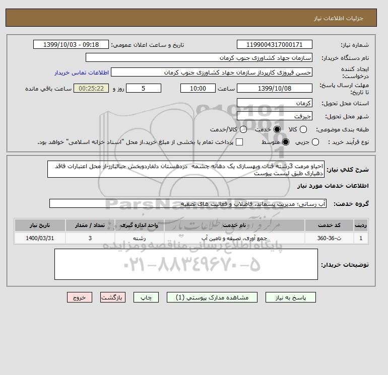 شرح کلی نیاز: احیاو مرمت 3رشته قنات وبهسازی یک دهانه چشمه دردهستان دلفاردوبخش جبالبارز-از محل اعتبارات فاقد دهیاری طبق لیست پیوست