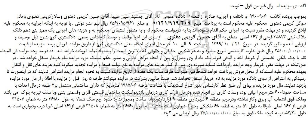 بموجب پرونده کلاسه  9900906  و دادنامه و اجراییه صادره از شعبه1  دادگاه عمومی  له:  آقای جمشید عنبی علیها: آقای حسین کریمی دهنوی وسالارکریمی دهنوی وخانم سوگل کریمی دهنوی  محکوم علیه محکوم است به پرداخت  مبلغ  5/121/919/209   و مبلغ  256/095/961 ریال نیم عشر دولتی . با توجه به اینکه اجراییه به محکوم علیه ابلاغ گردیده و در مهلت مقرر نسبت به اجرای حکم اقدام ننموده اند بنا به درخواست محکوم له و به منظور استیفای  محکوم به و هزینه های اجرایی یک ممیز پنج دهم دانگ پلاک ثبتی 35823 فرعی از 162 اصلی  متعلق به آقای حسین کریمی دهنوی    از سوی این اجرا توقیف و توسط کارشناس رسمی  دادگستری کرج بشرح ذیل توصیف و ارزیابی شده و مقرر گردیده  در  مورخ  21 /  10 /1399  از ساعت  9  الی  10  در محل اجرای احکام مدنی دادگستری کرج از طریق مزایده بفروش برسد. مزایده از قیمت 25/000/000/000 ریال طبق نظریه کارشناسی شروع میشود و به هر شخص  حقیقی و حقوقی که بالاترین قیمت را پیشنهاد نماید فروخته خواهد شد . ده درصد وجه مزایده فی المجلس بصورت وجه نقد یا چک بانکی  تضمینی از خریدار اخذ و الباقی ظرف یک ماه از وی وصول و پس از انجام مراحل قانونی و صدور حکم تملیک مورد مزایده بنام خریدار منتقل خواهد شد . در صورتیکه در مهلت مقرر خریدار وجه مزایده راپرداخت ننماید سپرده وی پس از کسر هزینه های مزایده به نفع دولت ضبط و مزایده تجدید میگردد.کلیه هزینه های نقل و انتقال بعهده محکوم علیه است.که از محل فروش پرداخت خواهد شد.طرفین میتوانند ظرف مدت یک هفته از تاریخ مزایده نسبت به نحوه انجام مزایده اعتراض نمایند که در اینصورت تا رسیدگی به اعتراض از سوی دادگاه مورد مزایده به نام خریدار منتقل نخواهد شد. ضمناً طالبین بشرکت در مزایده میتوانند ظرف 5 روز  قبل از مزایده با اطلاع از مال مورد مزایده بازدید نمایند. مال مورد مزایده و بهای آن طبق نظر کارشناس بدین شرح است:مک با مساحت عرصه 1912/06 مترمربع که دارای ساختمانی مشتمل بر2 طبقه درحال احداث با مساحت حدودا600 متر مربع اعیانی بوده وسفت کاری ان انجام شده ودرحال نازک کاری درزمان بازدیدواسکلت ساختمان قسمتی فلزی وقسمتی بتنی وبا سقف تیرچه بلوک  می باشد وملک فوق انشعاب آب وبرق وگاز نداشته ودرحریم منطقه 6 شهرداری منطقه 9 قرارداردوپروانه ساخت ومجوز ندارد حدود اربع ملک شمالا به طول 36/80 متر به شماره 31507 فرعی از 162 اصلی  شرقا به طول 52 متر به قطعه 68 تفکیکی وجنوبا  دیواری است مشترک به طول 36/60 متر به شماره 31508 فرعی از162 اصلی غربا درب ودیواری است به طول 52/20متر به کوچه ملک فوق به مبلغ 25/000/000/000 ریال ارزیابی می گردد.