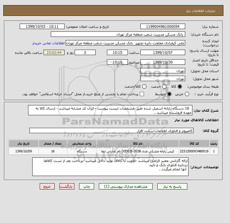 نام دستگاه خریدار: بانک مسکن مدیریت شعب منطقه مرکز تهران