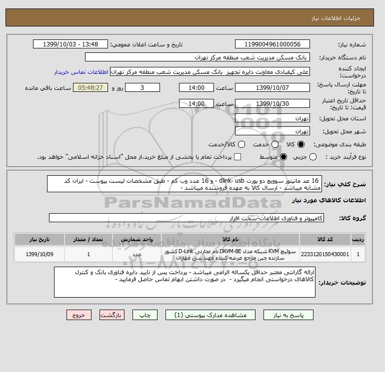 استعلام 16 عد مانیتور سوویچ دو پورت dlink- usb - و 16 عدد وب کم - طبق مشخصات لیست پیوست - ایران کد مشابه میباشد - ارسال کالا به عهده فروشنده میباشد -, استعلام 16 عد مانیتور سوویچ دو پورت dlink- usb - و 16 عدد وب کم - طبق مشخصات لیست پیوست - ایران کد مشابه میباشد - ارسال کالا به عهده فروشنده میباشد -
