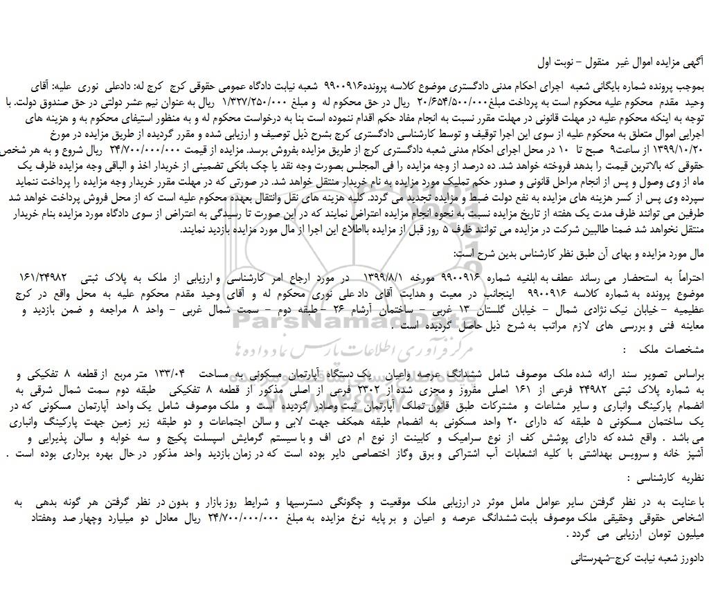 بموجب پرونده شماره بایگانی شعبه  اجرای احکام مدنی دادگستری موضوع کلاسه پرونده9900916  شعبه نیابت دادگاه عمومی حقوقی کرج  کرج له: دادعلی  نوری  علیه: آقای  وحید  مقدم  محکوم علیه محکوم است به پرداخت مبلغ20/654/500/000  ریال در حق محکوم له  و مبلغ 1/327/250/000  ریال به عنوان نیم عشر دولتی در حق صندوق دولت. با توجه به اینکه محکوم علیه در مهلت قانونی در مهلت مقرر نسبت به انجام مفاد حکم اقدام ننموده است بنا به درخواست محکوم له و به منظور استیفای محکوم به و هزینه های اجرایی اموال متعلق به محکوم علیه از سوی این اجرا توقیف و توسط کارشناسی دادگستری کرج بشرح ذیل توصیف و ارزیابی شده و مقرر گردیده از طریق مزایده در مورخ  1399/10/20 از ساعت9  صبح تا  10 در محل اجرای احکام مدنی شعبه دادگستری کرج از طریق مزایده بفروش برسد. مزایده از قیمت 24/700/000/000  ریال شروع و به هر شخص حقیقی و حقوقی که بالاترین قیمت را بدهد فروخته خواهد شد. ده درصد از وجه مزایده را فی المجلس بصورت وجه نقد یا چک بانکی تضمینی از خریدار اخذ و الباقی وجه مزایده ظرف یک ماه از وی وصول و پس از انجام مراحل قانونی و صدور حکم تملیک مورد مزایده به نام خریدار منتقل خواهد شد. در صورتی که در مهلت مقرر خریدار وجه مزایده را پرداخت ننماید سپرده وی پس از کسر هزینه های مزایده به نفع دولت ضبط و مزایده تجدید می گردد. کلیه هزینه های نقل وانتقال بعهده محکوم علیه است که از محل فروش پرداخت خواهد شد طرفین می توانند ظرف مدت یک هفته از تاریخ مزایده نسبت به نحوه انجام مزایده اعتراض نمایند که در این صورت تا رسیدگی به اعتراض از سوی دادگاه مورد مزایده بنام خریدار منتقل نخواهد شد ضمنا طالبین شرکت در مزایده می توانند ظرف 5 روز قبل از مزایده بااطلاع این اجرا از مال مورد مزایده بازدید نمایند.