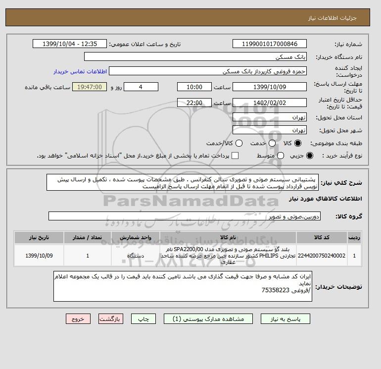 شرح کلی نیاز: پشتیبانی سیستم صوتی و تصویری سالن کنفرانس . طبق مشخصات پیوست شده ، تکمیل و ارسال پیش نویس قرارداد پیوست شده تا قبل از اتمام مهلت ارسال پاسخ الزامیست