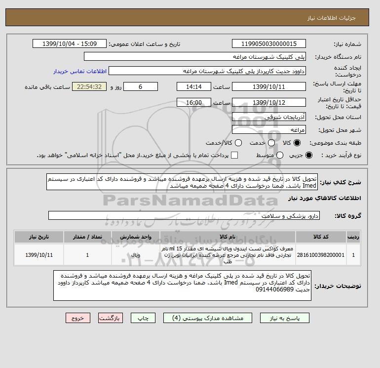 توضیحات خریدار:تحویل کالا در تاریخ قید شده در پلی کلینیک مراغه و هزینه ارسال برعهده فروشنده میباشد و فروشنده دارای کد اعتباری در سیستم Imed باشد. ضمنا درخواست دارای 4 صفحه ضمیمه میباشد کارپرداز داوود جدیت 09144066989