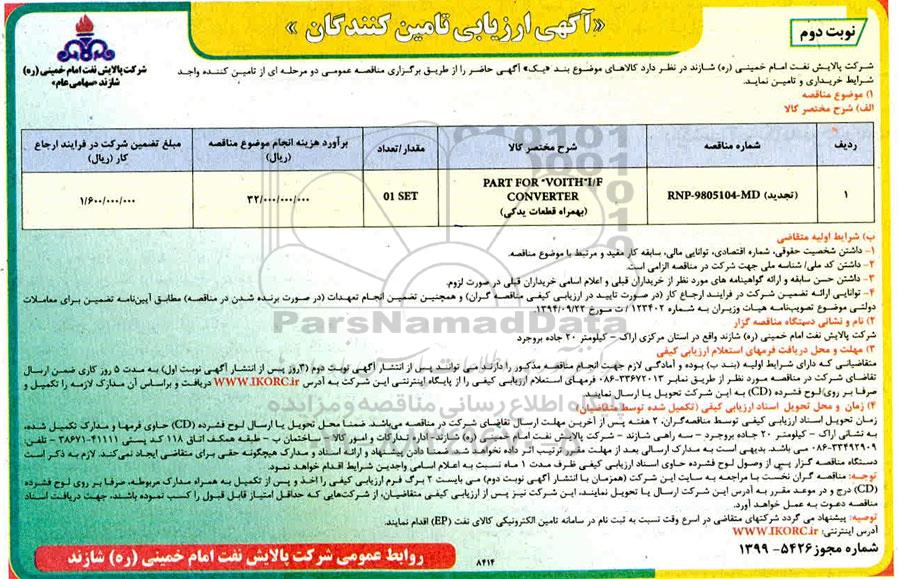 ارزیابی کیفی تامین کنندگان PART FOR VOITH I/F CONVERTER به همراه قطعات یدکی نوبت دوم از کلیه افراد متخصص و شرکتها واجد شرایط دعوت به عمل میآید در مناقصه با کد خبرگزاری پارس نماد: 3003739 شرکت نمایند.