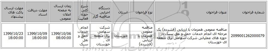 | 2099001262000079 | مناقصه عمومی همزمان با ارزیابی (فشرده) یک مرحله ای انجام خدمات حمل و نقل سبک در حوزه های عملیاتی شرکت سهامی برق منطقه ای خوزستان | مناقصه عمومی همزمان با ارزیابی (فشرده) | خوزستان | شرکت سهامی برق منطقه ای خوزستان | انجام خدمات حمل و نقل سبک | 1399/10/06 08:00:00 | 1399/10/09 18:00:00 | 1399/10/23 18:00:00 |