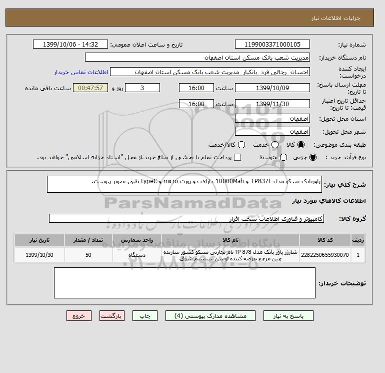 شرح کلی نیاز: پاوربانک تسکو مدل TP837L و 10000Mah دارای دو پورت micro و typeC طبق تصویر پیوست.