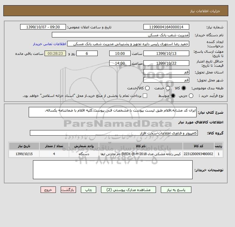 استعلام بها و موضوع استعلام استعلام ایران کد مشابه.اقلام طبق لیست پیوست با مشخصات فنی پیوست.کلیه اقلام با ضمانتنامه یکساله. به اطلاع کلیه شرکت‌ها و افراد متخصص واجد شرایط می‌رساند، آگهی گذار در نظر دارد از طریق استعلام بها، نسبت به انتخاب و دریافت پیشنهادات اقدام نماید. این استعلام با کد آگهی ثبت شده در سامانه خبرگزاری پارس نماد : 3008111 منتشر شده است. مشخصات استعلام : تاریخ شروع استعلام: 1399/10/07 آخرین مهلت ارسال پیشنهاد قیمت : 1399/10/13 و محل اجرای پروژه : استان قم میباشد. استعلام قیمت مورد درخواست : استعلام ایران کد مشابه.اقلام طبق لیست پیوست با مشخصات فنی پیوست.کلیه اقلام با ضمانتنامه یکساله. با دسته‌بندی‌های تخصصی و گروه های مرتبط : کامپیوتر, استعلام اطلاع رسانی میگردد. شرایط شرکت در استعلام آنلاین : ابتدا ثبت نام در سامانه استعلام پارس نماد و تکمیل مدارک موردنیاز و بارگذاری در سامانه رعایت تمامی ضوابط و الزامات مندرج در اسناد استعلام است.