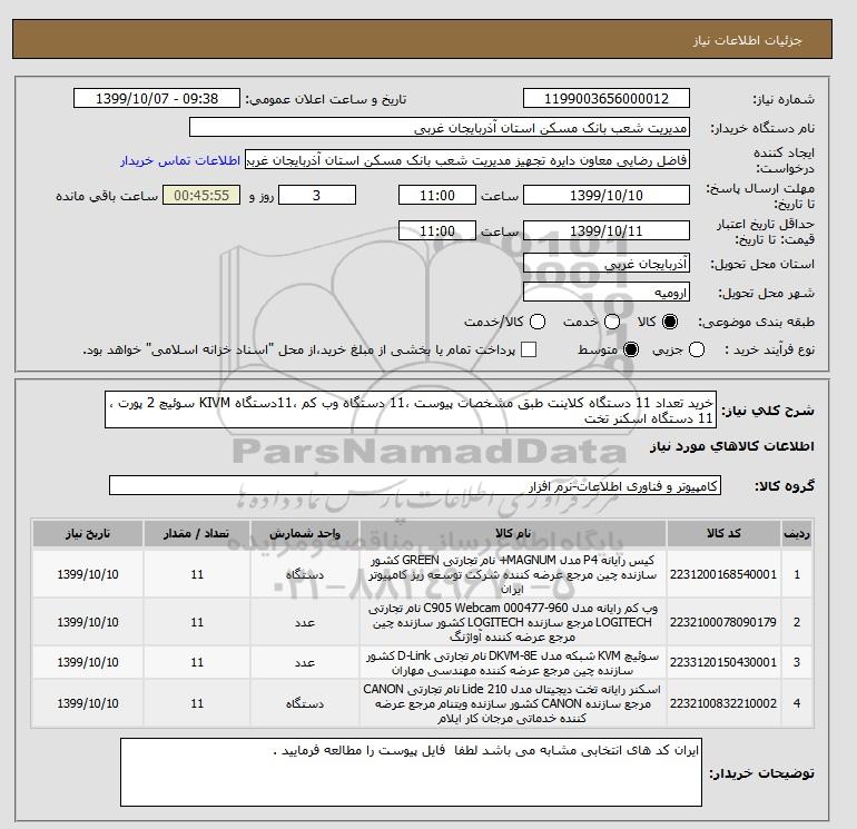 شرح کلی نیاز: خرید تعداد 11 دستگاه کلاینت طبق مشخصات پیوست ،11 دستگاه وب کم ،11دستگاه KIVM سوئیچ 2 پورت ،11 دستگاه اسکنر تخت