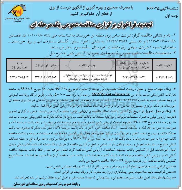 99/9041009/ م  2099001262000079 انجام خدمات حمل و نقل سبک در حوزه های عملیاتی شرکت سهامی برق منطقه ای خوزستان  134.814.073.184 5.396.281.464