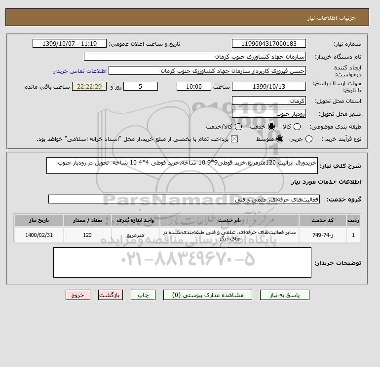 شرح کلی نیاز: خریدورق ایرانیت 120مترمربع،خرید قوطی9*9 10 شاخه،خرید قوطی 4*4 10 شاخه تحویل در رودبار جنوب