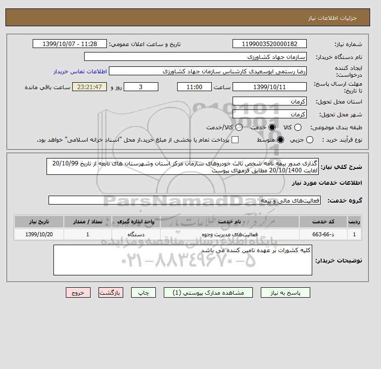 استعلام بها و موضوع استعلام استعلام گذاری صدور بیمه نامه شخص ثالث خودروهای سازمان مرکز استان وشهرستان های تابعه از تاریخ 20/10/99 لغایت 20/10/1400 مطابق فرمهای پیوست به اطلاع کلیه شرکتها و افراد متخصص واجد شرایط میرساند، آگهی گذار در نظر دارد از طریق استعلام بها، نسبت به انتخاب و دریافت پیشنهادات اقدام نماید. این استعلام با کد آگهی ثبت شده در سامانه خبرگزاری پارس نماد : 3009435 منتشر شده است. مشخصات استعلام : تاریخ شروع استعلام: 1399/10/07 آخرین مهلت ارسال پیشنهاد قیمت : 1399/10/10 و محل اجرای پروژه : استان مناقصات استان کرمان میباشد. استعلام قیمت مورد درخواست : استعلام گذاری صدور بیمه نامه شخص ثالث خودروهای سازمان مرکز استان وشهرستان های تابعه از تاریخ 20/10/99 لغایت 20/10/1400 مطابق فرمهای پیوست با دستهبندیهای تخصصی و گروه های مرتبط : خدمات بیمه ای, استعلام اطلاع رسانی میگردد.