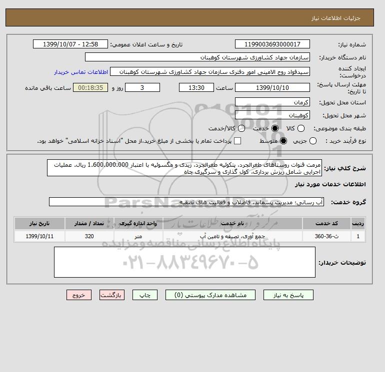 شرح کلی نیاز: مرمت قنوات روستاهای طغرالجرد، پتکوئیه طغرالجرد، زیدی و مگسوئیه با اعتبار 1.600.000.000 ریال. عملیات اجرایی شامل ریزش برداری، کول گذاری و سرگیری چاه