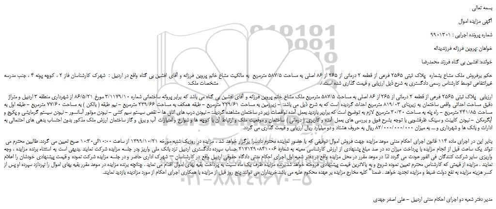 حکم برفروش ملک مشاع بشماره پلاک ثبتی 2565 فرعی از قطعه 2 درمانی از 265 از 86 اصلی به مساحت 587/5 مترمربع به مالکیت مشاع خانم پروین فرزانه و آقای افشین بی گناه واقع در اردبیل : شهرک کارشناسان فاز 2 ، کوچه پونه 4 ، جنب مدرسه غیرانتفاعی توسط کارشناس رسمی دادگستری به شرح ذیل ارزیابی و قیمت گذاری شده است./. مشخصات ملک: