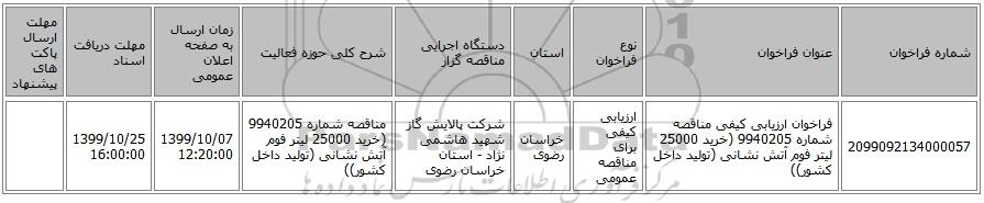 | 2099092134000057 | فراخوان ارزیابی کیفی مناقصه شماره 9940205 (خرید 25000 لیتر فوم آتش نشانی (تولید داخل کشور)) | ارزیابی کیفی برای مناقصه عمومی | خراسان رضوی | شرکت پالایش گاز شهید هاشمی نژاد - استان خراسان رضوی | مناقصه شماره 9940205 (خرید 25000 لیتر فوم آتش نشانی (تولید داخل کشور)) | 1399/10/07 12:20:00 | 1399/10/25 16:00:00 |