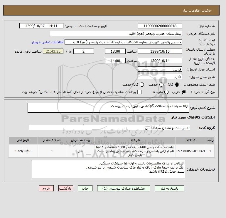 | 1 | 0973100562010064 | لوله تاسیسات جنس GRP متری قطر 1000 mm فشار 1 bar نام تجارتی بلفا مرجع عرضه کننده مهندسی پیشتاز صنعت پارس خرم | متر | 1 | 1399/10/18 |