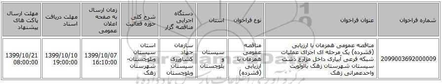 مناقصه، مناقصه عمومی همزمان با ارزیابی (فشرده) یک مرحله ای اجرای عملیات شبکه فرعی آبیاری داخل مزارع دشت سیستان شهرستان زهک بااولویت واحدعمرانی زهک از کلیه افراد متخصص و شرکت‌ها واجد شرایط دعوت به عمل می‌آید در مناقصه با کد خبرگزاری پارس نماد: 3010945 شرکت نمایند. این مناقصه در تاریخ 1399/10/07 شروع و مهلت آن تا تاریخ 1399/10/10 میباشد.