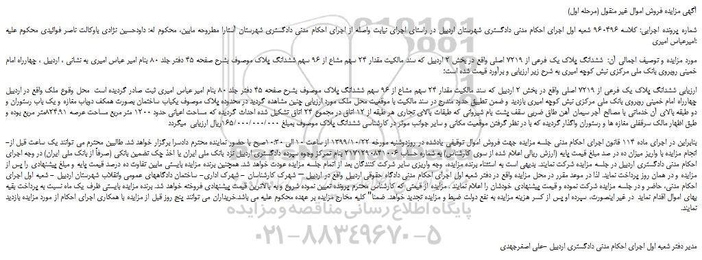 مورد مزایده و توصیف اجمالی آن: ششدانگ پلاک یک فرعی از 7219 اصلی واقع در بخش 2 اردبیل که سند مالکیت مقدار 24 سهم مشاع از 96 سهم ششدانگ پلاک موصوف بشرح صفحه 45 دفتر جلد 80 بنام امیر عباس امیری به نشانی ، اردبیل ، چهارراه امام خمینی روبروی بانک ملی مرکزی نبش کوچه امیری به شرح زیر ارزیابی و برآورد قیمت شده است؛