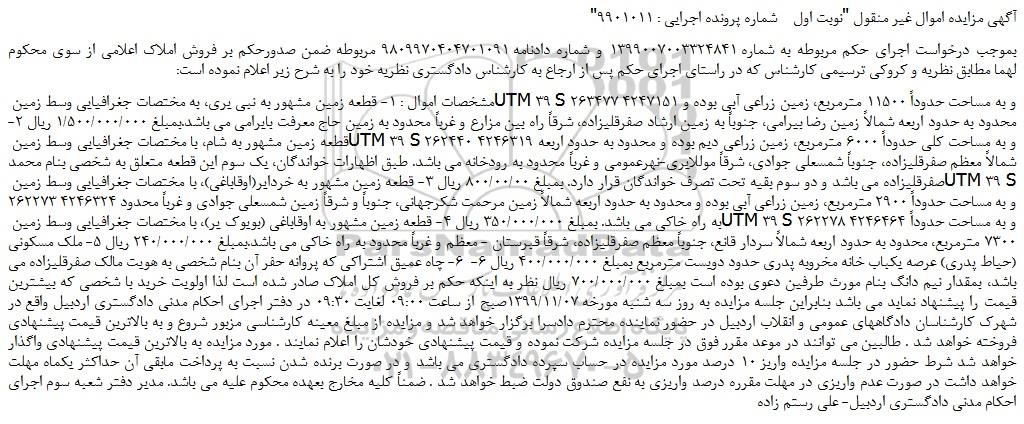 "آگهی مزایده اموال غیر منقول "نوبت اول شماره پرونده اجرایی : 9901011