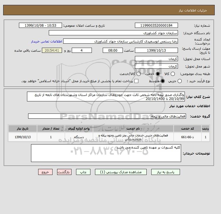 شرح کلی نیاز: واگذاری صدور بیمه نامه شخص ثالث جهت خودروهای سازمان مراکز استان وشهرستان های تابعه از تاریخ 20/10/99 تا 20/10/1400