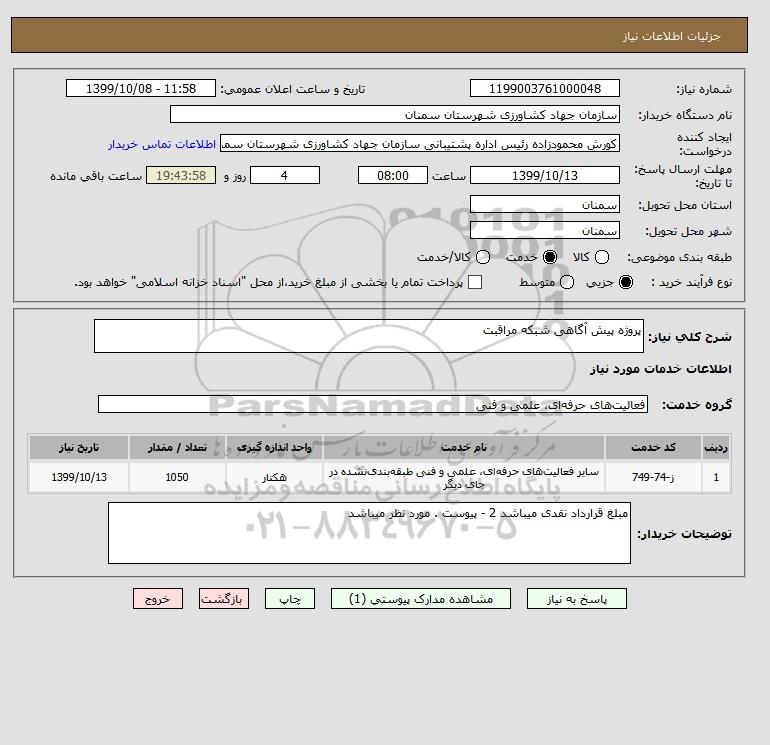 استعلام بها و موضوع استعلام استعلام پروژه پیش آگاهی شبکه مراقبت به اطلاع کلیه شرکتها و افراد متخصص واجد شرایط میرساند، آگهی گذار در نظر دارد از طریق استعلام بها، نسبت به انتخاب و دریافت پیشنهادات اقدام نماید. این استعلام با کد آگهی ثبت شده در سامانه خبرگزاری پارس نماد : 3013888 منتشر شده است. مشخصات استعلام : تاریخ شروع استعلام: 1399/10/08 آخرین مهلت ارسال پیشنهاد قیمت : 1399/10/12 و محل اجرای پروژه : استان مناقصات استان سمنان میباشد. استعلام قیمت مورد درخواست : استعلام پروژه پیش آگاهی شبکه مراقبت با دستهبندیهای تخصصی و گروه های مرتبط : تجهیزات و خدمات کشاورزی و دامپروری, استعلام اطلاع رسانی میگردد.