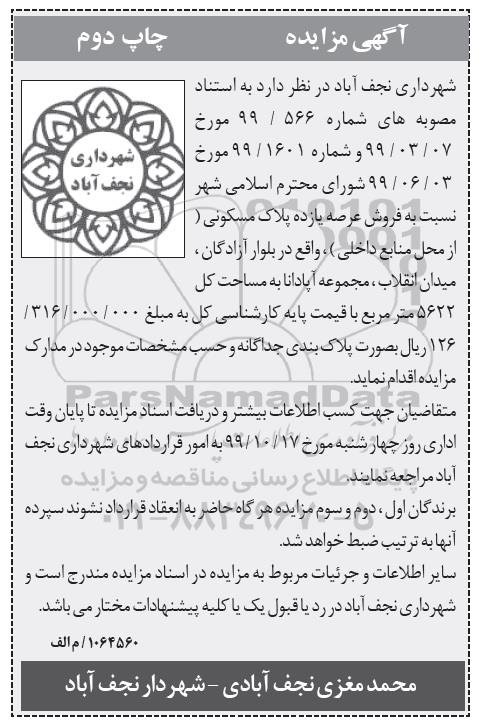 مزایده عمومی مزایده فروش عرصه یازده پلاک مسکونی 5622 مترمربع چاپ دوم برگزار میگردد. از کلیه افراد متخصص و شرکتهای واجد شرایط دعوت به عمل میآید تا در این مزایده با کد خبرگزاری پارس نماد : 3014173 شرکت نمایند تاریخ شروع مزایده : 1399/10/08 مهلت شرکت در مزایده: تا پایان روز 1399/10/17 مکان برگزاری اموال واگذاری استانهای اصفهان و دستهبندیهای مربوط به این حراجی املاک و زمین میباشد.