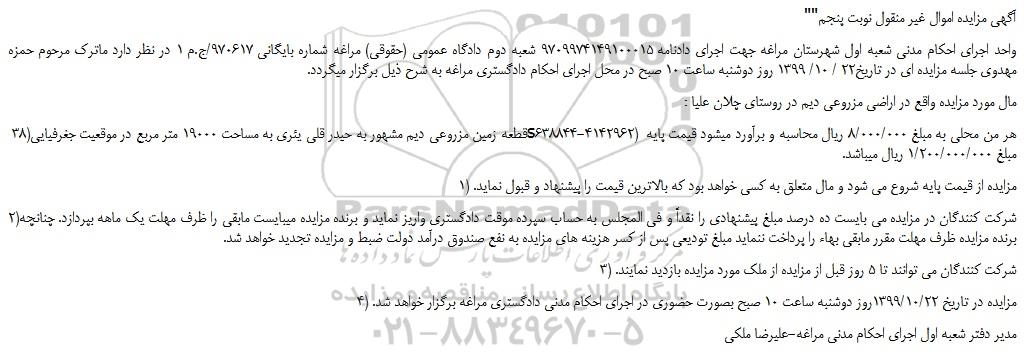 واحد اجرای احکام مدنی شعبه اول شهرستان مراغه جهت اجرای دادنامه 9709974149100015 شعبه دوم دادگاه عمومی (حقوقی) مراغه شماره بایگانی 970617/ج.م 1 در نظر دارد ماترک مرحوم حمزه مهدوی جلسه مزایده ای در تاریخ22 / 10/ 1399 روز دوشنبه ساعت 10 صبح در محل اجرای احکام دادگستری مراغه به شرح ذیل برگزار میگردد.
