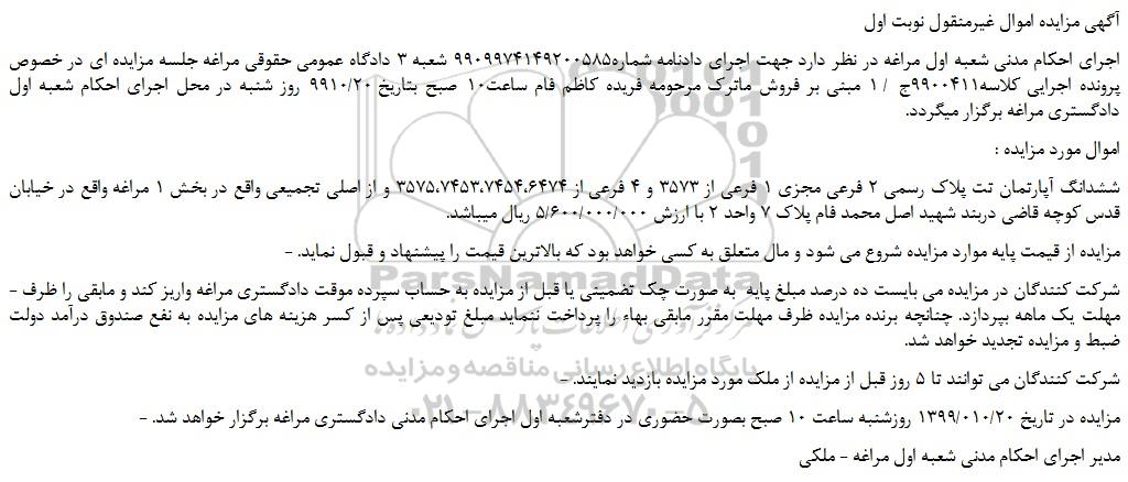 اجرای احکام مدنی شعبه اول مراغه در نظر دارد جهت اجرای دادنامه شماره9909974149200585 شعبه 3 دادگاه عمومی حقوقی مراغه جلسه مزایده ای در خصوص پرونده اجرایی کلاسه9900411ج / 1 مبنی بر فروش ماترک مرحومه فریده کاظم فام ساعت10 صبح بتاریخ 9910/20 روز شنبه در محل اجرای احکام شعبه اول دادگستری مراغه برگزار میگردد.