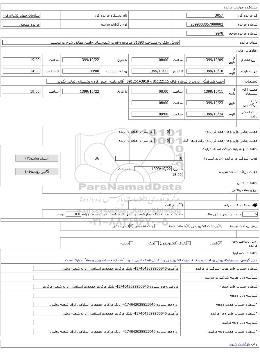 | عنوان مزایده | فروش ملک به مساحت 31090 مترمربع واقع در شهرستان ورامین مطابق شرح در پیوست | |||