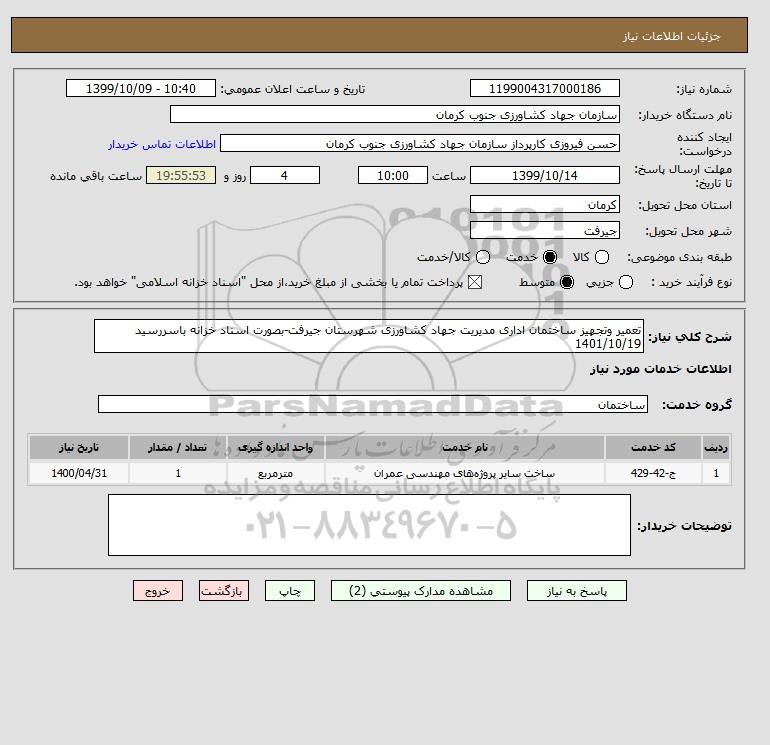شرح کلی نیاز: تعمیر وتجهیز ساختمان اداری مدیریت جهاد کشاورزی شهرستان جیرفت-بصورت اسناد خزانه باسررسید 1401/10/19