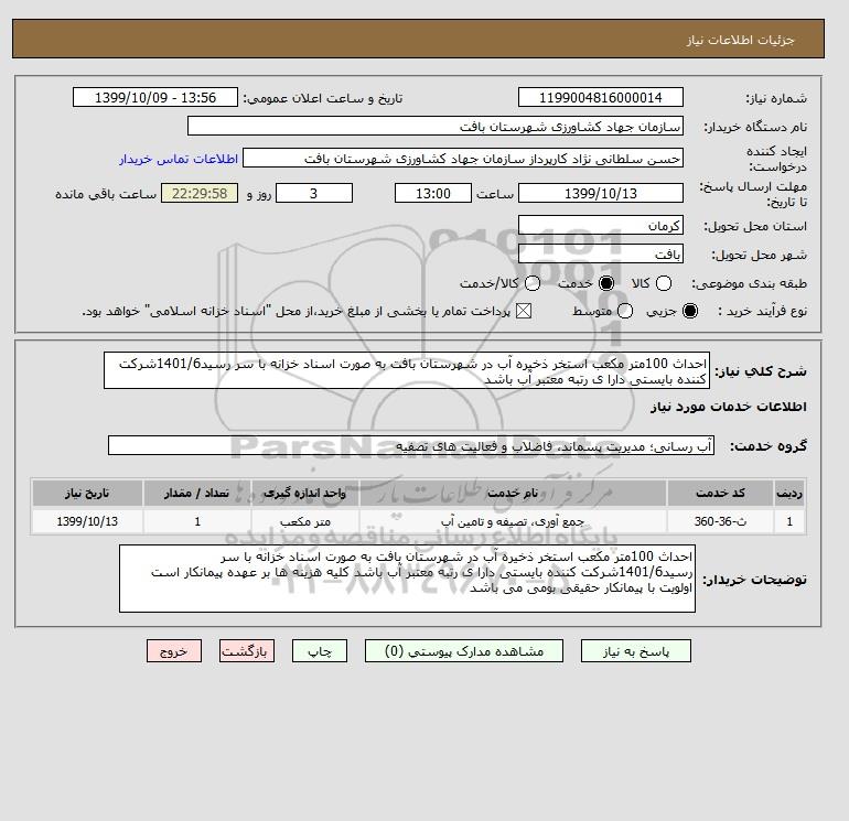 شرح کلی نیاز: احداث 100متر مکعب استخر ذخیره آب در شهرستان بافت به صورت اسناد خزانه با سر رسید1401/6شرکت کننده بایستی دارا ی رتبه معتبر آب باشد