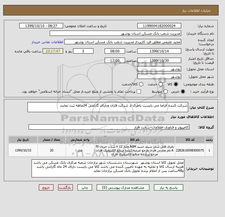 شرح کلی نیاز: شرکت کننده الزاما می بایست باطری از شرکت فاران ودارای گارانتی 24ماهه ثبت نمایند