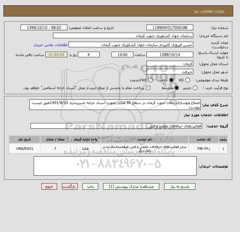 شرح کلی نیاز: اصلاح ونوسازی باغات جنوب کرمان در سطح 90 هکتار-بصورت اسناد خزانه باسررسید 1401/6/21طبق لیست پیوست