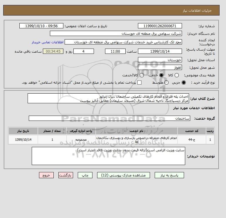 استعلام بها و موضوع استعلام استعلام احداث پله فلزی و انجام کارهای تکمیلی ساختمان دیزل ژنراتور مرکز دیسپاچنگ ناحیه شمال شرق (مسجد سلیمان) مطابق آنالیز پیوست به اطلاع کلیه شرکتها و افراد متخصص واجد شرایط میرساند، آگهی گذار در نظر دارد از طریق استعلام بها، نسبت به انتخاب و دریافت پیشنهادات اقدام نماید. این استعلام با کد آگهی ثبت شده در سامانه خبرگزاری پارس نماد : 3020950 منتشر شده است. مشخصات استعلام : تاریخ شروع استعلام: 1399/10/10 آخرین مهلت ارسال پیشنهاد قیمت : 1399/10/14 و محل اجرای پروژه : استان خوزستان میباشد. استعلام قیمت مورد درخواست : استعلام احداث پله فلزی و انجام کارهای تکمیلی ساختمان دیزل ژنراتور مرکز دیسپاچنگ ناحیه شمال شرق (مسجد سلیمان) مطابق آنالیز پیوست با دستهبندیهای تخصصی و گروه های مرتبط : سازه های فلزی و فضایی, ساختمان, استعلام اطلاع رسانی میگردد.