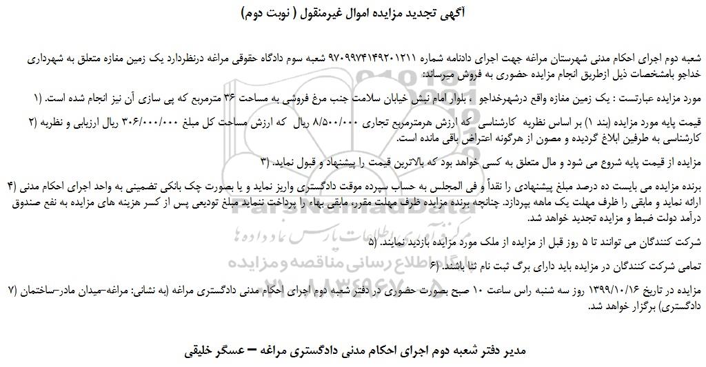 شعبه دوم اجرای احکام مدنی شهرستان مراغه جهت اجرای دادنامه شماره 9709974149201211 شعبه سوم دادگاه حقوقی مراغه درنظردارد یک زمین مغازه متعلق به شهرداری خداجو بامشخصات ذیل ازطریق انجام مزایده حضوری به فروش میرساند: